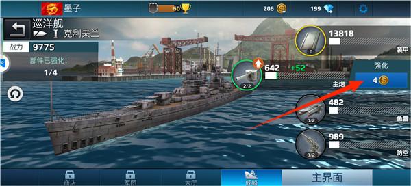4、还可以利用获得的资源奖励来升级你的战舰,提升血量装甲以及炮管攻击力。