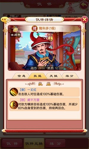 游戏中,隆科多为资质12防御型卡牌。技能为对敌方横排造成100%基础伤害,并减少60%自身受到伤害。与皇太后、鄂敏、恒亲王享有人物缘分加成。不错的面伤技能和减少伤害,推荐放在前排,入手指数4颗星。