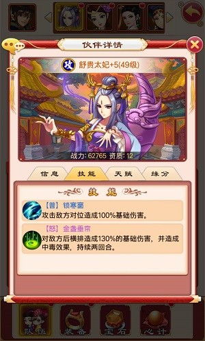 游戏中,舒贵太妃为面伤法攻型卡牌,资质12!技能可对敌方后横排造成130%的基础伤害并附带中毒效果。并与果郡王、欣嫔、皇太后等人物享有缘分加成。推荐搭配一些其他切后排的卡牌(眉庄、皇太后等),方能发挥其最大功效哦。卡牌评价四颗星半,推荐小主入手哦。