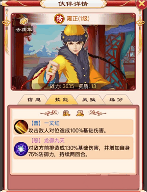 游戏中的皇上却是(萌萌哒)有少年雍正的感觉。意气风发。 君子之学,博于外而尤贵精于内。怒气加防 130%的伤害。防属性。又有输出!