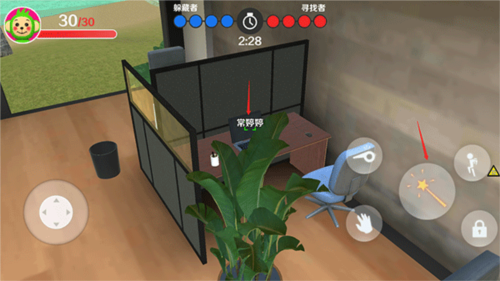5、躲藏者需要在游戏中将自己变身为场景内的各种物品来进行躲藏,将视角对准需要变身的物品后,点击魔法棒按钮。