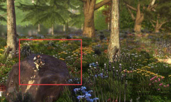 3、身处花丛场景,按画面提示查看【石头】附近区域,探索可能的互动点或收集物品。