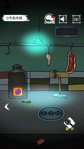 可从看到是一间肉铺,把木偶放到炉子里烧,就能够得到紫色的宝石,再点水井盖,可以把紫色宝石镶缺在上面