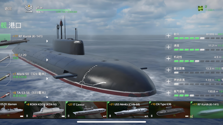 北风之神,只是听名字就给人以威严感,作为俄罗斯的先进核潜艇之一,它拥有19节的航速和高达19万的血量,续航能力极强,氧气含量达到了惊人的390。在武器配置方面,北风之神可携带两枚不同类型的导弹和两枚鱼雷,虽然整体火力略显薄弱,不太适合用来刷金币或进行高强度输出作战,但作为一艘生存能力强、行动灵活的潜艇,在战术突袭或中远程支援战斗中仍有其价值。