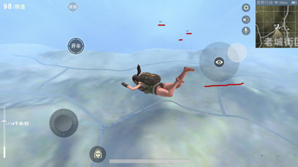 14、图中划线的都是跳伞的人,如果是组队状态下可以看到队友的名字,没有名字的都是即将战斗的对手,可以通过观察看出来人群大概的走向,在没有开伞前还可以选择远离他们,但是开伞后滑行速度会减弱,一般会落在附近,难免一战!