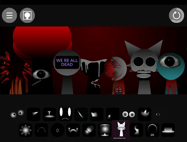 3、sprunki模组的特色在于恐怖模式,我们现在把最后一个黑帽子拖到角色上。