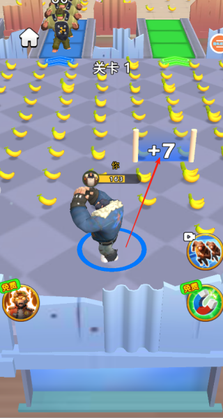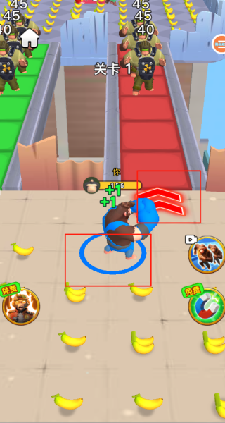 1、操控猿猴不断在场景之中拾取香蕉,提升经验值,提高角色等级。