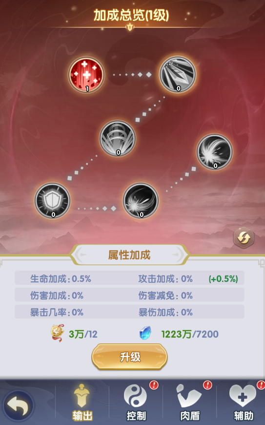 可消耗宗门贡献和灵石分别升级输出/控制/肉盾/辅助四大职业的各项技能属性