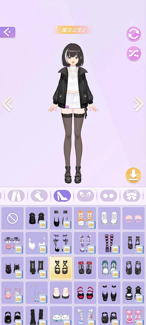 3、定好基本身体外观后开始按照外观来选服饰,这里的所有服饰点击AD都可以免广告直接解锁的,我选择了黑色系列想把她打造成暗黑魔法公主。