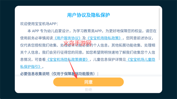 在本站下载宝宝机场,打开,点击同意