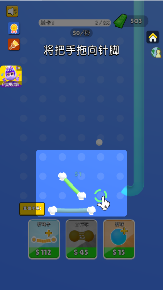 游戏中,玩家通过布置绳子,引导小球在其中不断弹跳。弹跳的次数越多,玩家赢得的钱币奖励也越多。