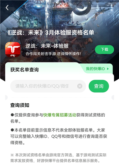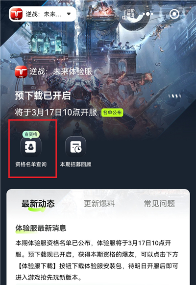 1、在好游快爆App搜索逆战未来,点击页面上方的【资格名单查询】。