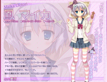 阳平的同班同学,一位来自俄罗斯的混血儿留学生。她痴迷秋叶原文化,性格活泼,常邀请阳平一同逛街,是阳平最好的朋友。 她身高145厘米,银色头发,经常穿着猫耳风衣,自称“比起买胸罩,会选择买烤鱿鱼”。 随着她因家庭原因面临突然回国的变故,故事的核心冲突由此展开。