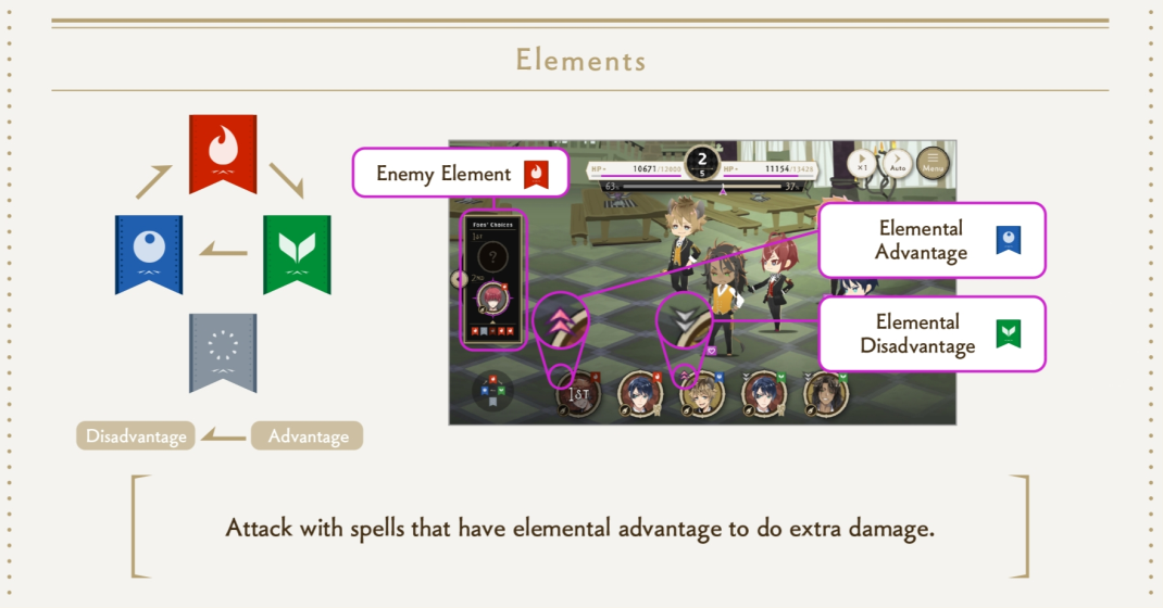 角色根据元素属性组成队伍,参与战斗(类似策略 RPG),技能与组合策略会影响战斗结果。