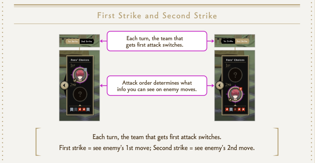 在限定回合战中,只有五个回合;而在无限战中,有无穷(∞)个回合。当前场上的最后一张卡牌的攻击结束后即为一个回合,一个回合为1T(one Turn)。在战斗的过程中,通过界面上方的数值可以查看当前为第几回合。对战时,此回合拖出的两张卡片与对面的两个角色分别进行一对一的对战。第一回合时为玩家先手,玩家的卡牌会在相对应的敌方卡片之前进行攻击、加buff与debuff的操作。第二回合则为敌方先手,之后便按照此顺序进行循环。