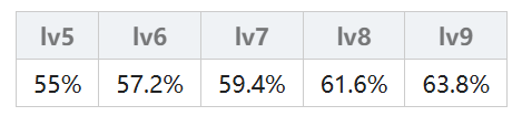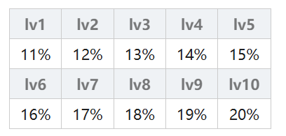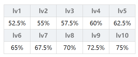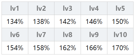 由连击次数决定,一连击(弱)的连击倍率为 50% + 2.5% × (魔法等级),一连击(强)的连击倍率为 62.5% + 3.75% × (魔法等级);二连击(弱)的连击倍率为 47.25% + 2.25% × (魔法等级),二连击(强)的连击倍率为 59.625% + 3.375% × (魔法等级);三连击从lv5开始计算,三连击(弱)的连击倍率为 50% + 2% × (魔法等级),三连击(强)的连击倍率为80%;无属性另做计算其实就是火、木、水属性×1.1。具体结果在下表中,不想计算的可以直接查表。