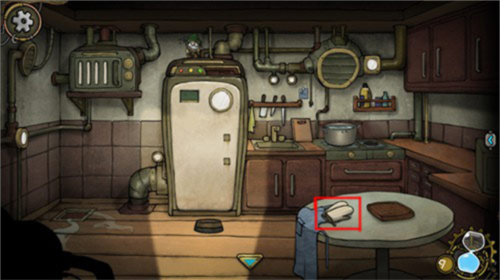 8、进入厨房后,可以看到桌子上放着一双隔热手套,点击获得手套。