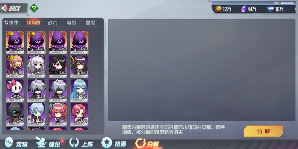 第五栏为分解界面,可将多余宠物进行分解,分解后宠物消失,会返还部分培养道具,且获得觉醒石