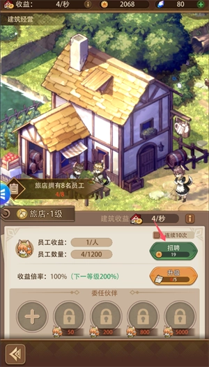 2、有了金币我们可以通过消耗金币来雇佣员工,让我们的旅店收益更高