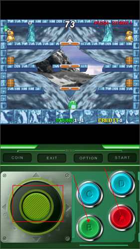 3、左边的轮盘控制人物的移动,A是扔炸弹,B是控制人物跳跃。需要注意每次只能扔一枚炸弹。通过打败怪物获得的加速鞋还具有幻影特效,还可以炸木桶获取道具,来帮助你过关。