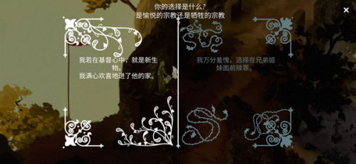 注:我第一遍玩的时候也完成了上述事件,但是第一个选择并没有出现,一个猜想是在前面的章节中做出的选择倾向于善,才能出现愉悦的宗教,不确定对不对。