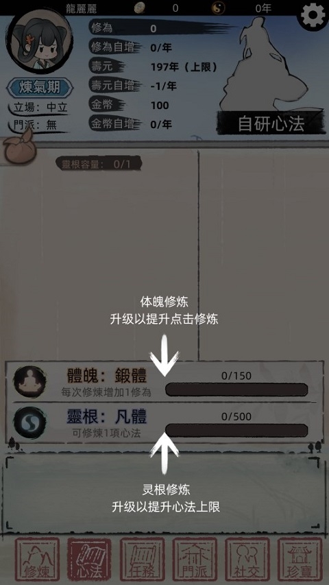 关于心法:有两个重要数值,一个是体魄修炼,一个是灵根修炼。升级体魄,可以提升点击修炼的速度;升级灵根,可以提升心法的数值上限。