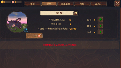 6、点击头像还可以进入信息菜单面板,分为几个选项卡,可以使用地图,改进角色,生孩子,获得成就等,需要退出点击右上角就可以关闭菜单。