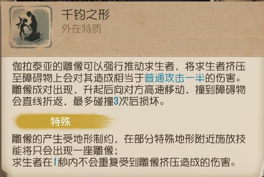 ③ 求生者在一秒内不会连续受到雕像的挤压伤害,因此不要一次施放很多雕像。