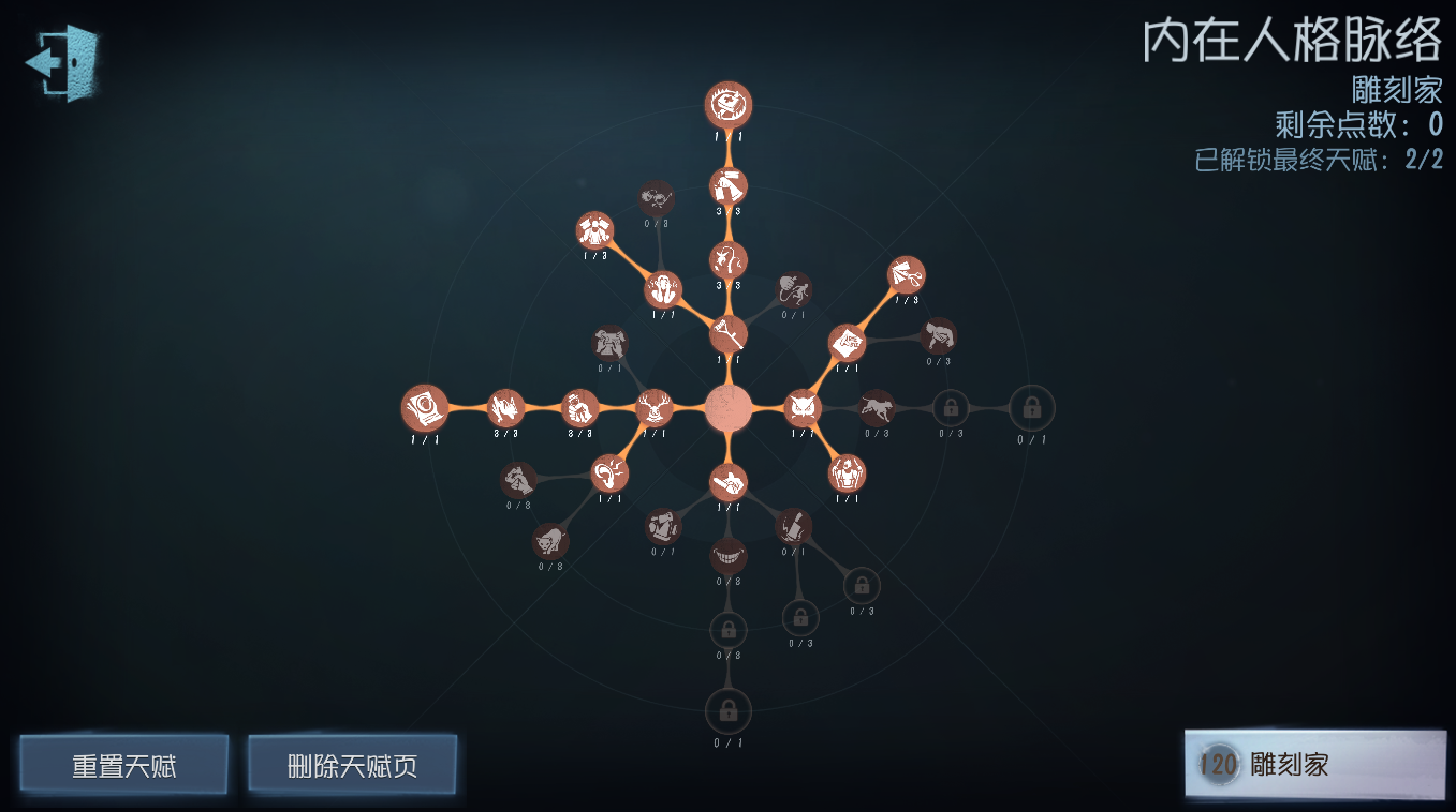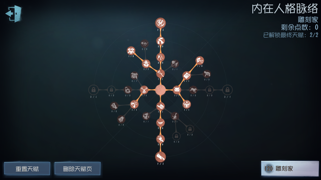 天赋总结:这几套天赋中都点了一部分减少眩晕状态的天赋,比如【愤怒】和【困兽之斗】,因为当前版本求生者可以击晕监管者的道具较多,比如前锋、勘探员、空军、画家、击球手等等,有干扰能力的求生者,会让雕刻家非常头疼,所以天赋中【愤怒】对雕刻家很重要,而【困兽之斗】可以看情况选择,当有2个及以上拥有干扰能力的求生者时,建议带上【困兽之斗】。