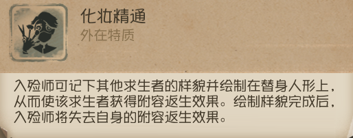 此特质是入殓师辅助的核心特质,如果队友被监管者追击时经过我们附近,并且被记下了样貌,可以考虑为其绘制替身人形,以此来减轻救人位的压力。