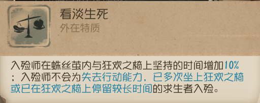 入殓师的【外在特质-看淡生死】配合【假寐】天赋,能够很大程度的减缓狂欢之椅起飞倒计时的速度,为队友破译以及救援争取到更多的时间。
