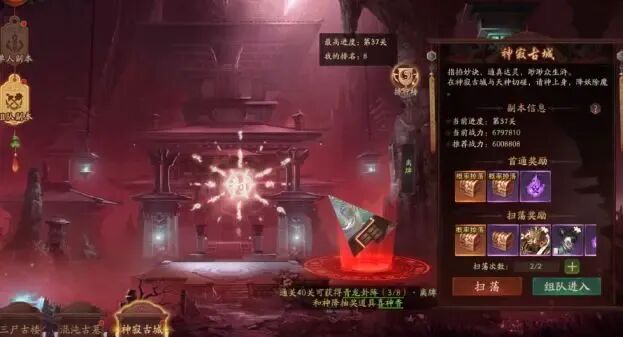 神寂古城(210级开启)通关掉落初级神君元魄、神通宝箱、八卦牌等材料。有助于神君的养成。