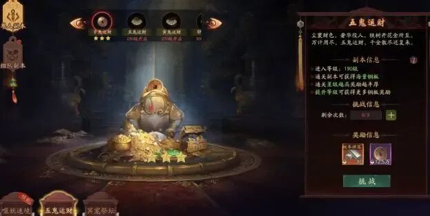 五鬼运财通关可获得海量铜板。道友们升级道术和锻造装备都离不开铜板,尤其是装备锻造,需要大量的铜板(记得买满额外挑战次数哦!)。