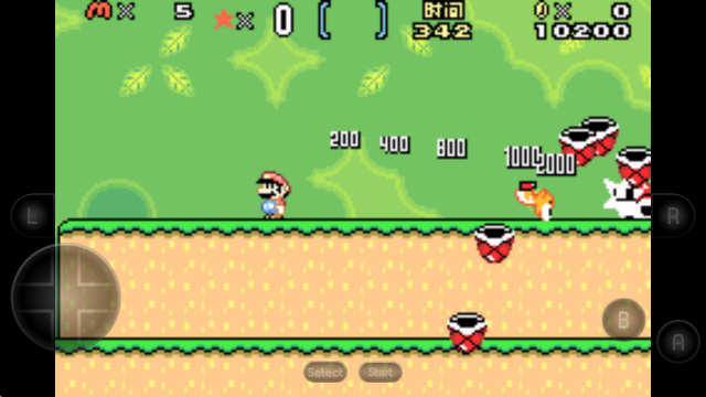 2、左侧的摇杆控制移动,右侧A键进行跳跃,拾取蘑菇之后点击B键即可射击。