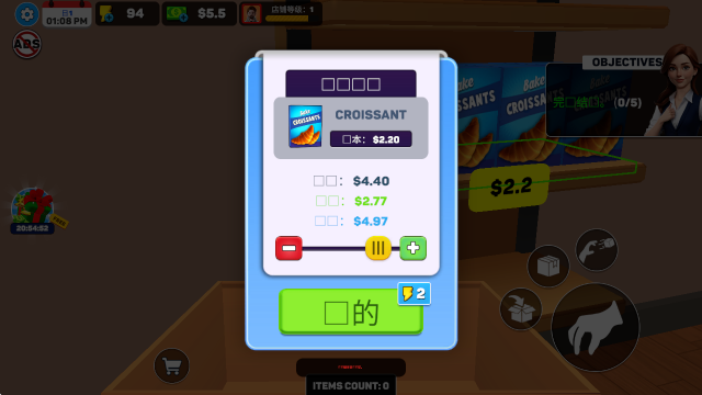 在面包店超市模拟器中扩展您的业务并将其推向更高的高度!解锁面包店、熟食店或咖啡馆等新区域,使您的产品多样化并吸引更广泛的顾客。随着产品范围的扩大,您将能够满足不同的口味和需求,确保您的超市在竞争中脱颖而出。你发展得越多,吸引的顾客就越多,让你建立自己的超市帝国。在这个激动人心的模拟商场游戏中,战略性地管理您的资源,升级您的商店,并成为终极超市大亨!