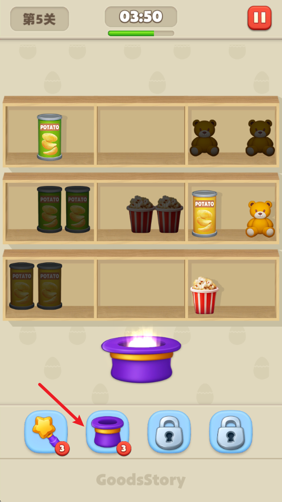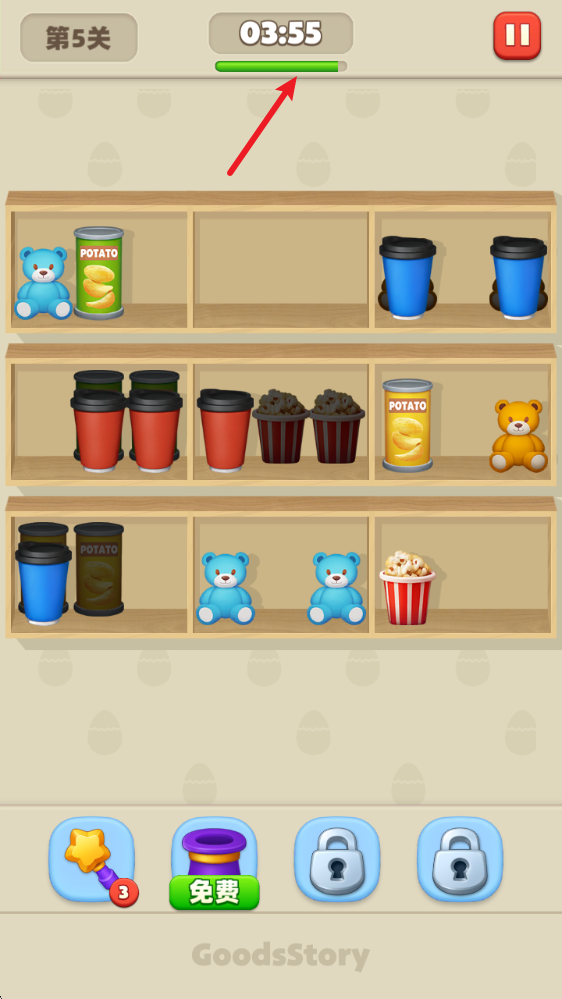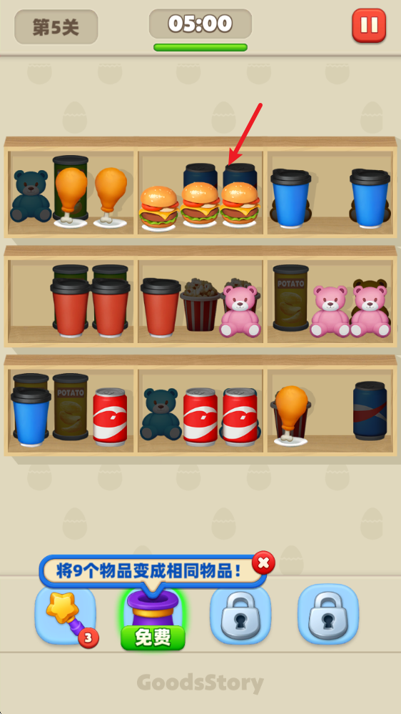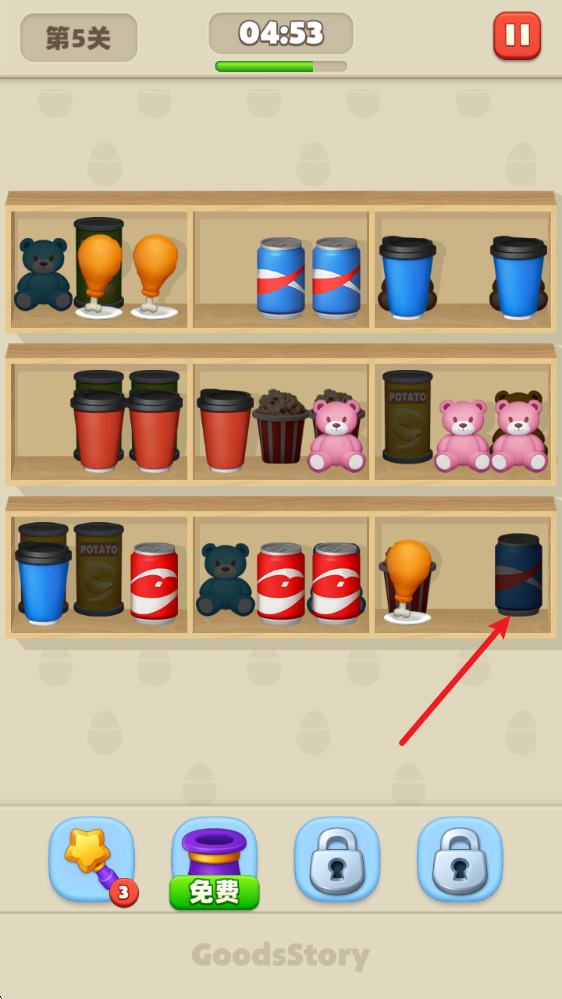 1、游戏玩法十分简单,拖动物品,让相同的三个物品摆放在同一货柜即可。