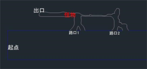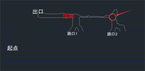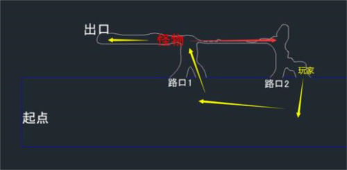 4、怪物不追你才慢慢向下走再回到第一条路,这样怪物被吸引到右上角,玩家走路口1就通过了。