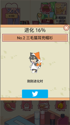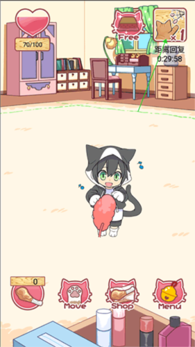 点击中下方的move,可以进去收集鸡腿,收集好之后,返回,再点击左下角的鸡腿就可以喂给猫猫吃了,之后猫猫的衣服就会升级为三毛猫耳兜帽衫了;