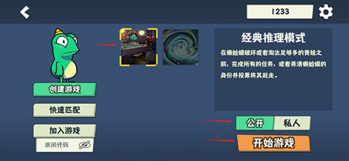 1、选择你喜欢的模式(默认给的经典推理模式),选择公开或者私人房间(私人房间只能通过房间代码搜索进入),点击开始游戏;