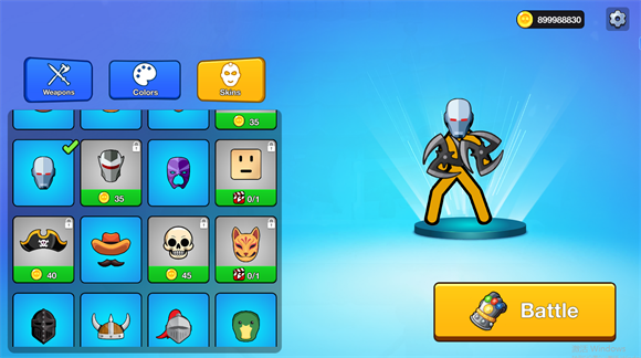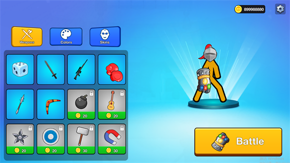 1、进入游戏后可以为自己的火柴人选择武器装备,不同的装备有不一样的效果