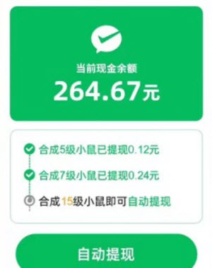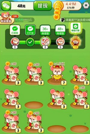 鼠你暴富赚钱小游戏中,玩家可以通过合成来免费领取红包。合成的老鼠等级越高得到的奖励也是越大的,红包是真实可提现的,满0.3即可到账。游戏支持微信快捷登录,上线先简单的做下新手任务,只需几分钟就能得到奖励,接下来玩一会儿,还可以得到额外的奖励,打发时间还是不错的。