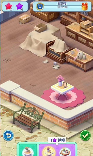 2、下面开始修复奶茶店,先摆放些新茶几,点击任务,开始重建集市,摆放茶几需要消耗1颗红星