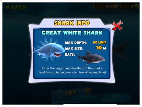 掠食各种鱼类、游泳者、渔夫,从幼仔成长到10吨的大白鲨!与其它鲨鱼、潜水艇、以及更多奇奇怪怪的深海生物作战,获得高分!