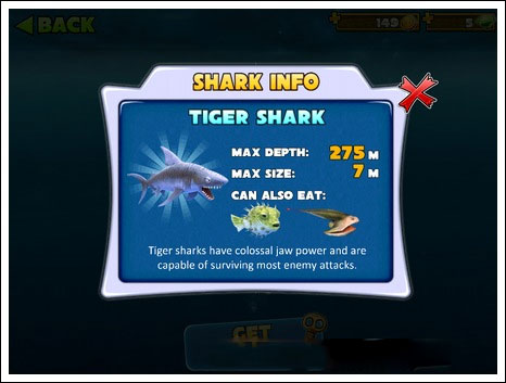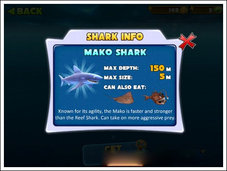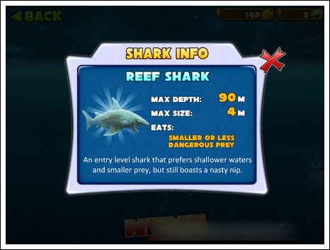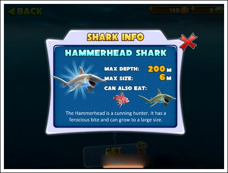 完成50个任务,寻找宝物取得金币与宝石,用来升级你的鲨鱼或者购买特殊救生道具。