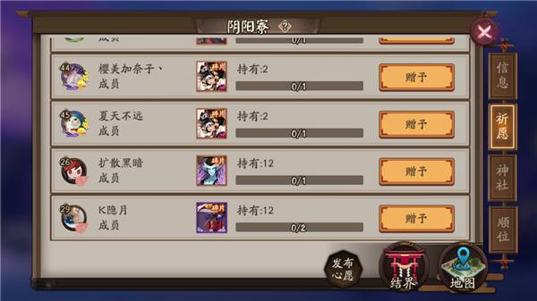 4、阴阳寮:阴阳寮等于其他游戏中的工会或者战盟、帮派。加入阴阳寮可以祈愿,每一天都能向同僚和好友们祈求你需要的式神碎片一次。R级可以祈求三个碎片,SR级可以祈求两片,SSR只能祈求一片。需要至少拥有一个该式神碎片才能祈愿,N级一次可以祈求四个碎片,但大部分人不会祈愿N级碎片…僚友每次只可以捐出一片,好友则可以捐满为止,只要他碎片数量够,但需要和好友达到一定的羁绊,亲密度足够才可以捐碎片。而神社是购买各种加成,这个萌新们就不用管了,你们的大哥会对你们负责的。