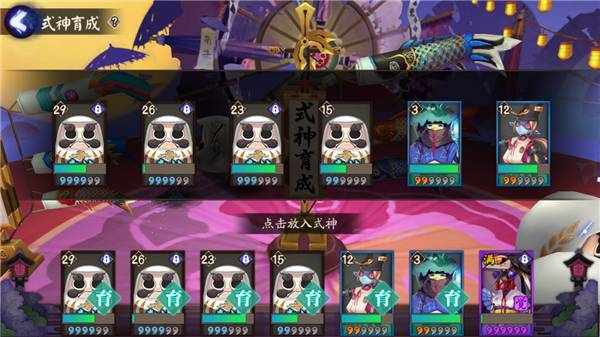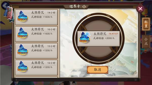 式神育成中可以放入六个式神,旁边的结界卡(符咒)装备以后,会按时间获得经验(需要手动收取)。式神育成推荐放入奉为达摩,这样最省心。