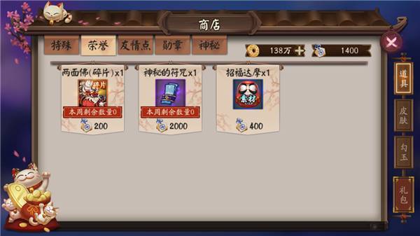 5、商店:商店中,皮肤、勾玉、礼包就不说了,荣誉里每周蓝票记得一定要买,应该优先于两面佛,荣誉点通过每周斗技获得。友情点是每天和好友互赠获得,可以累积不用,以备应急。