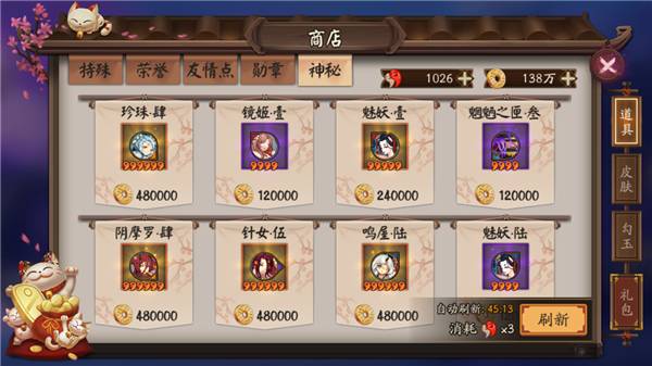 勋章是商店里最重要的,因为这里产出御行达摩(黑蛋),所以每天一定要好好打结界突破,每周至少凑够700勋章买御行达摩和蓝票(御行达摩优先于蓝票)。