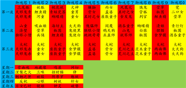 7、御魂塔:出产御魂的神秘场所,之所以说它神秘是因为到现在我也没搞懂,为什么一个组队里,一个人获得好东西其他人就一定获得很差,甚至我刷八层的时候出现过只有金币,但是我的同伴那一场获得了六星御魂。这个问题大家可以共通研究一下。御魂塔1-4层出产4星以下御魂,5、6层出产5星以下御魂,7层以上出产6星以下御魂(目前御魂最高六星)。作为萌新经常会听到别人说好式神不如好御魂,这说的是那些满级或者接近满级的人。如果在看攻略的时候你还是萌新,那说明你已经掉队了。要想尽快赶上大部队或者在新区迅速拔尖,我推荐在四十级之前别去御魂,老老实实刷经验,因为刷经验也会掉御魂,困难掉落2-4星的(有掉过五星的联系我),且主流御魂都能在各个关卡刷到,经验很高升级很快。二、三十级打5星御魂和40级以后在御魂八层混六星的难度是差不多的。而5星御魂比4星御魂并没有质的差距。所以把体力用在打经验效率更高。如果是新区更不要过早去御魂塔,六星御魂之前都是式神星级大于御魂星级的。尽早让主力式神都5星,再连同两个靠谱的朋友一起去刷御魂七或者御魂八才是正确的。打御魂塔的技巧,7层之前带一个培养过的椒图和一个靠谱的草,都能横推。七层以后速度很重要,阴阳师用神乐,要山兔或者镰鼬先手拉速度,带座敷童子,没有茨木、天狗至少也要一只六星鸟,鸟的速度要比神乐快,再随便配个靠谱的输出就能过,记得童子的速度最好是在第三个,方便补鬼火。第八九层阵容一样,但是没必要带治疗了,高速输出比治疗重要,因为没有多余的鬼火用来治疗。要想自动过九层就要有相当稳定的输出,不能是那种暴击在50、60那种,至少要过90。第十层过的方法千奇百怪,什么博雅4招财山兔、什么2山兔2觉醒食发鬼,还有几种,居然还都无伤过十层,有空了单独写一篇讨论吧。Ps:萌新们混高层御魂时要注意,等级低没输出就把自己的式神切换为普通攻击模式,不要抢输出式神的鬼火。上人的时候尽量选血厚的式神。
