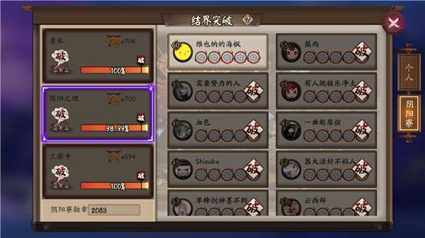 9、结界突破:本游戏最大良心环节。个人结界突破,是通过探索关卡、刷御魂等,可以获得突破票,每个人上限可以获得20张,多了就不再累积。消耗突破票可以攻打对方的结界,成功后可以获得勋章、体力、百鬼票、金币、结界卡、勾玉。勋章可以兑换蓝票和黑蛋(对于很少花钱的朋友来说,这里几乎是唯一稳定获得黑蛋的地方)。所以请不要浪费突破票,有了就打。这里也是检验自己队伍与其他同级别玩家差距的地方,能够发现自己的不足。阴阳寮结界突破是加入阴阳寮以后,每天会长或副会长开启活动(时间一般会在阴阳寮公布),所有同僚们一起去进攻别的阴阳寮玩家,自己攻打成功以后也会获得上述奖励。对方阴阳寮被攻破超过90%,还能获得阴阳寮勋章,会长可以用来购买福利包、经验加成等。每次进攻有10分钟冷却时间,记得自己进攻以后可以在参与一次组队进攻。